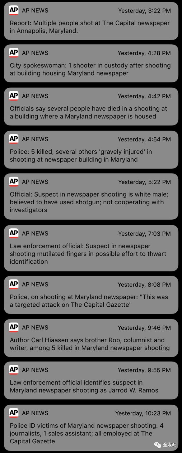 美联社新闻APP关于枪击案的推送,推送时间跨度超过7个小时