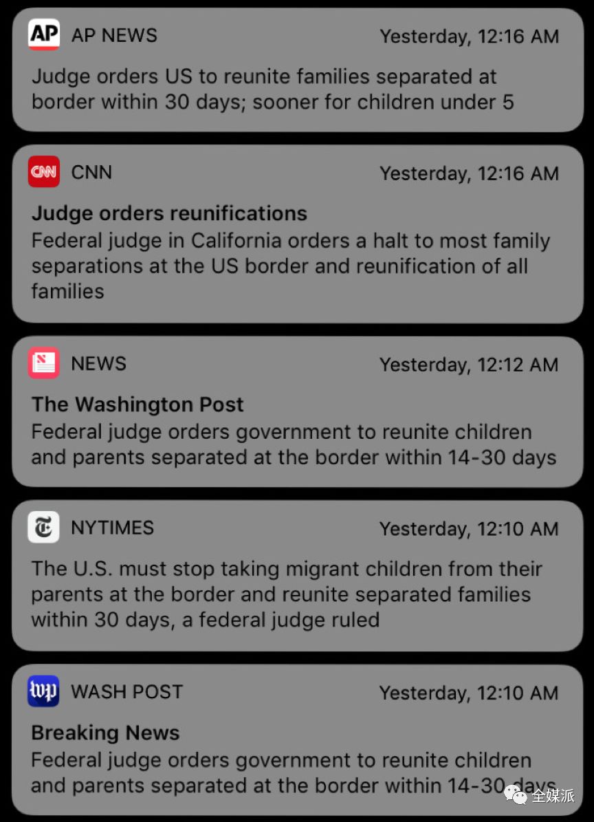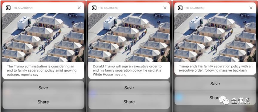 媒体开始在Push中引入更多非正式话语和对话内容,在就“特朗普政府的家庭分离政策”一事的推送中,“恐怖”、“令人不安”、“令人心碎”等极易调动感情色彩的形容词被多次使用。