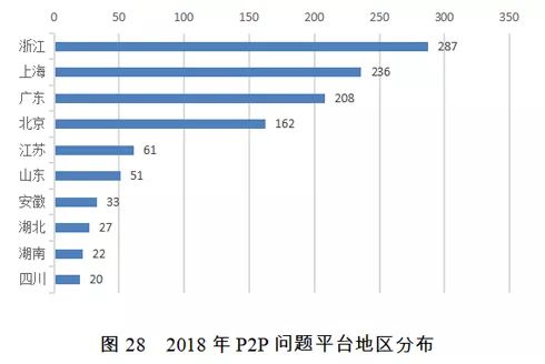 根据对各地公安机关公开信息的不完全统计,2018年出现问题的P2P平台有1282家,主要集中在浙江、上海、广东、北京等地区,其中浙江涉及问题平台数量最多,达287家,占总数的22.39%。