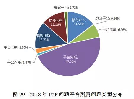 从平台产生问题的类型看,近50%的问题平台处于失联状态,14.51%的问题平台已进入警方调查程序,13.73%的问题平台出现提现困难的情况,另有11.86%的问题平台已暂停运营。
