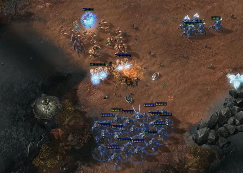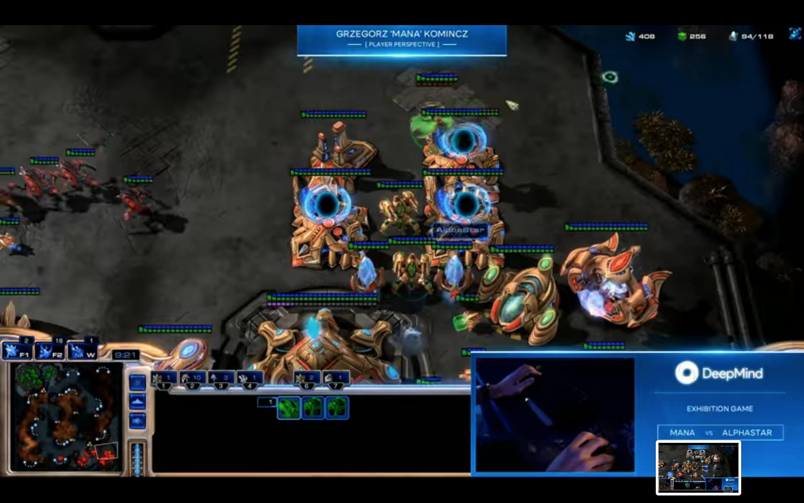 AlphaStar v. Komincz的第四场比赛中,AlphaStar的追猎者(蓝)从三方攻击Komincz的不朽者、执政官、狂热者(红),AlphaStar的追猎者最终赢得了比赛继而摧毁了Komincz的基地。