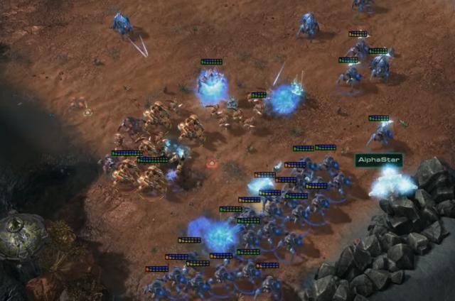 这就为AlphaStar创造了一个机会:用一大群追猎者进行攻击,让前排的搞搞破坏,接着在被干掉之前闪现到后排,然后再慢慢补血。如此反复轮换,AlphaStar就可以在自己损失不大的情况下对敌方造成大量破坏。