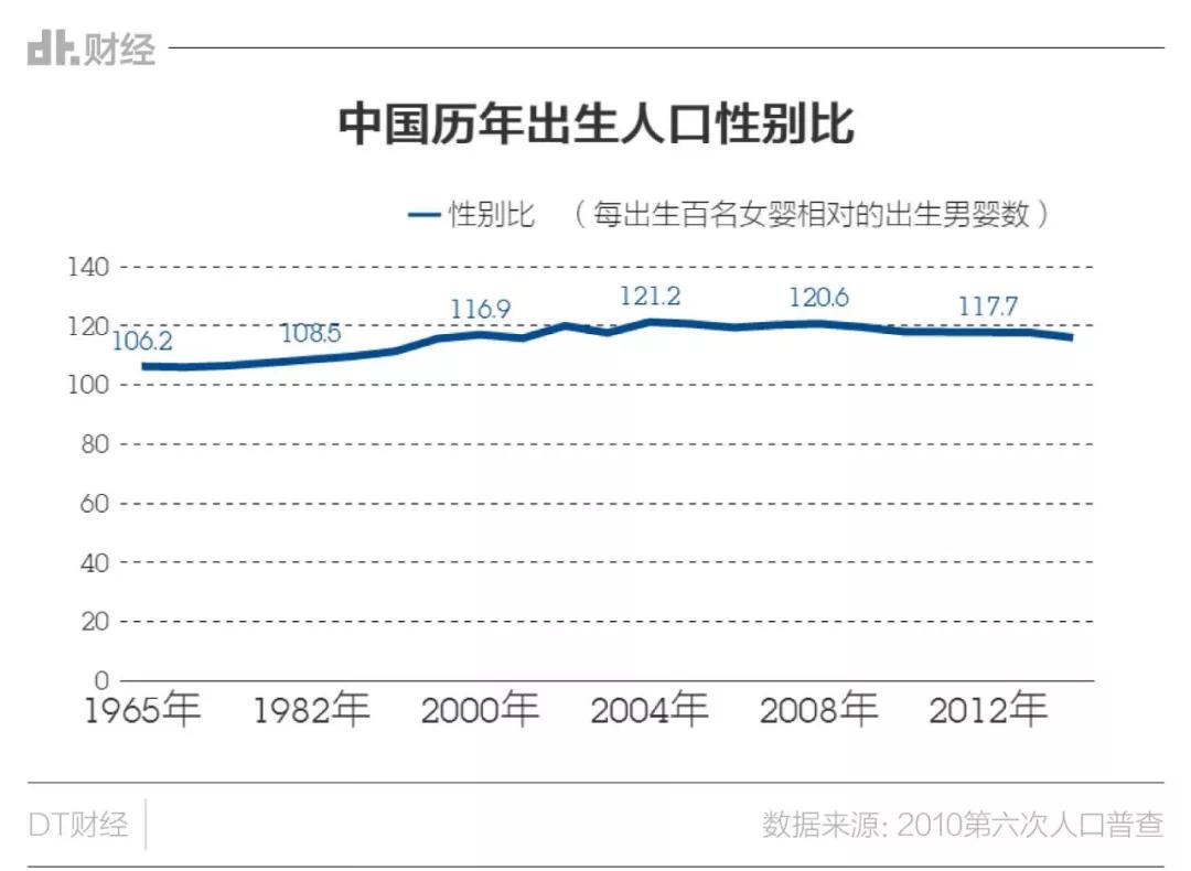 然而我国的出生人口性别比在近20年基本没有低于115。这意味着什么呢?从出生开始,男孩子就比女孩子多出了至少15%。
