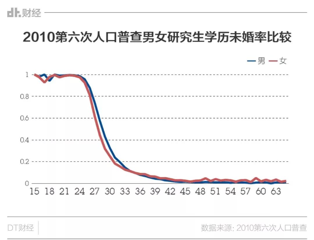 数据告诉我们,当大家都读到了研究生阶段,男女在各个年龄段的未婚率相当接近。到了四十好几,不管怎样都是能结婚的。