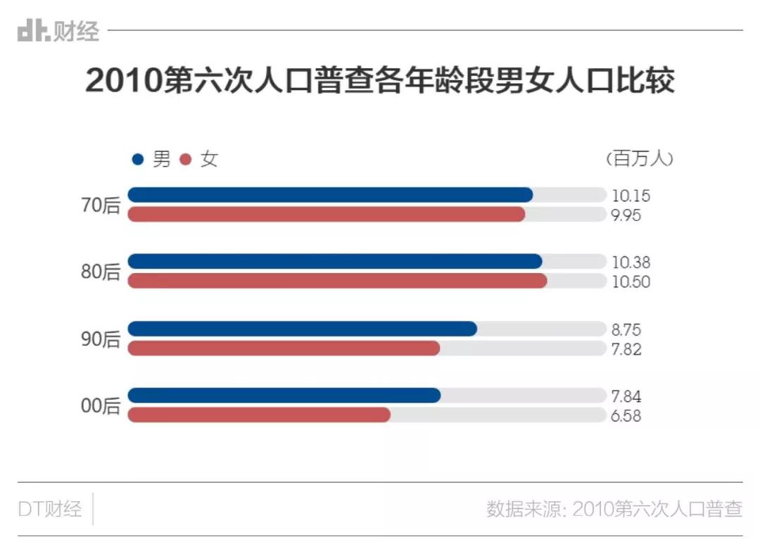 看看上图90后与00后中,女娃娃明显比男娃娃少了一大截。再联系我国老夫少妻的传统,70、80的大龄单身男青年还会娶走一部分“少妻”。