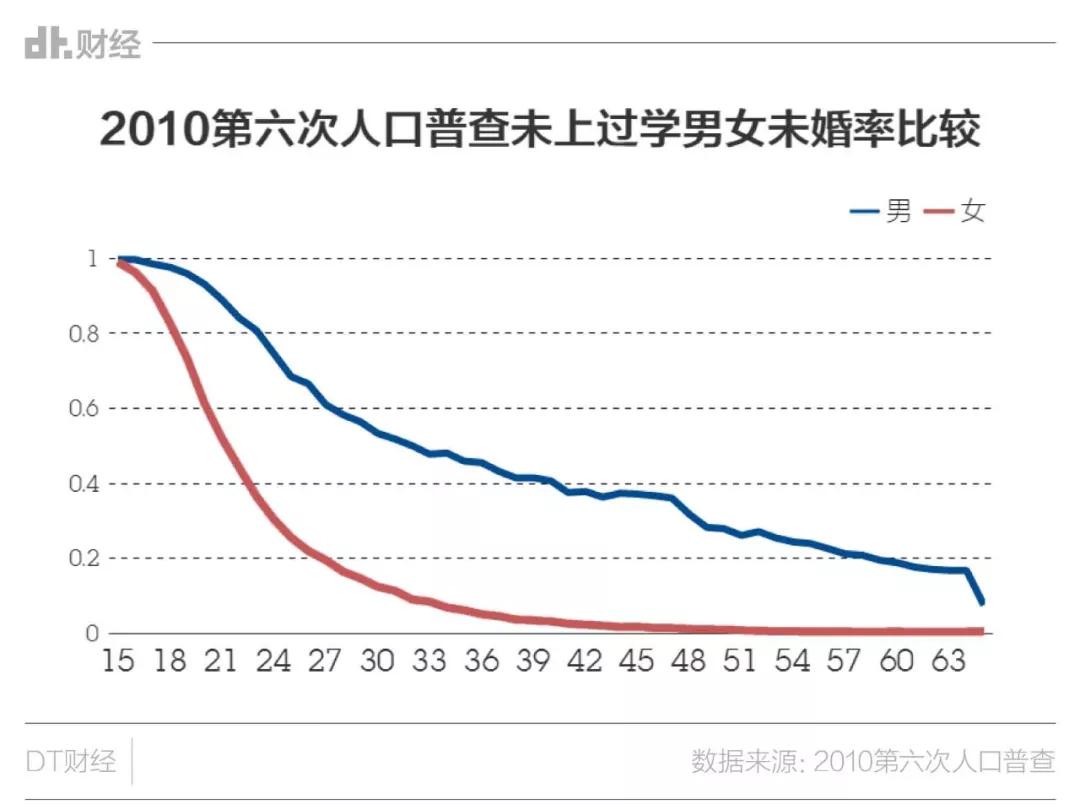 然而,如果看看那些没太上过学的朋友们,男女未婚率出现了极大分化。