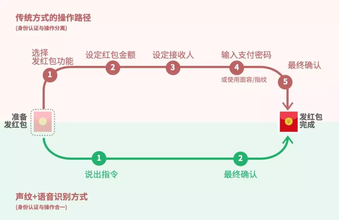 语音红包路径更短,体验更优的原因是在发出「给张三发送 52 元红包」这句语音里既包括了功能指令(发红包)、也包括了接收人信息(张三),也包括了金额数(52 元),同时声纹也完成了「支付密码」的身份判断。用户只需最终确认就能实现整个功能,类似应用案例已由得意音通公司实现并在 CSDN2018 AI 开发者大会演示。