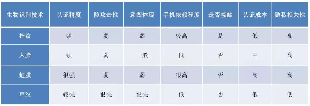 ▲ 相关生物特征识别类型的比较 图源:清华信息研究院