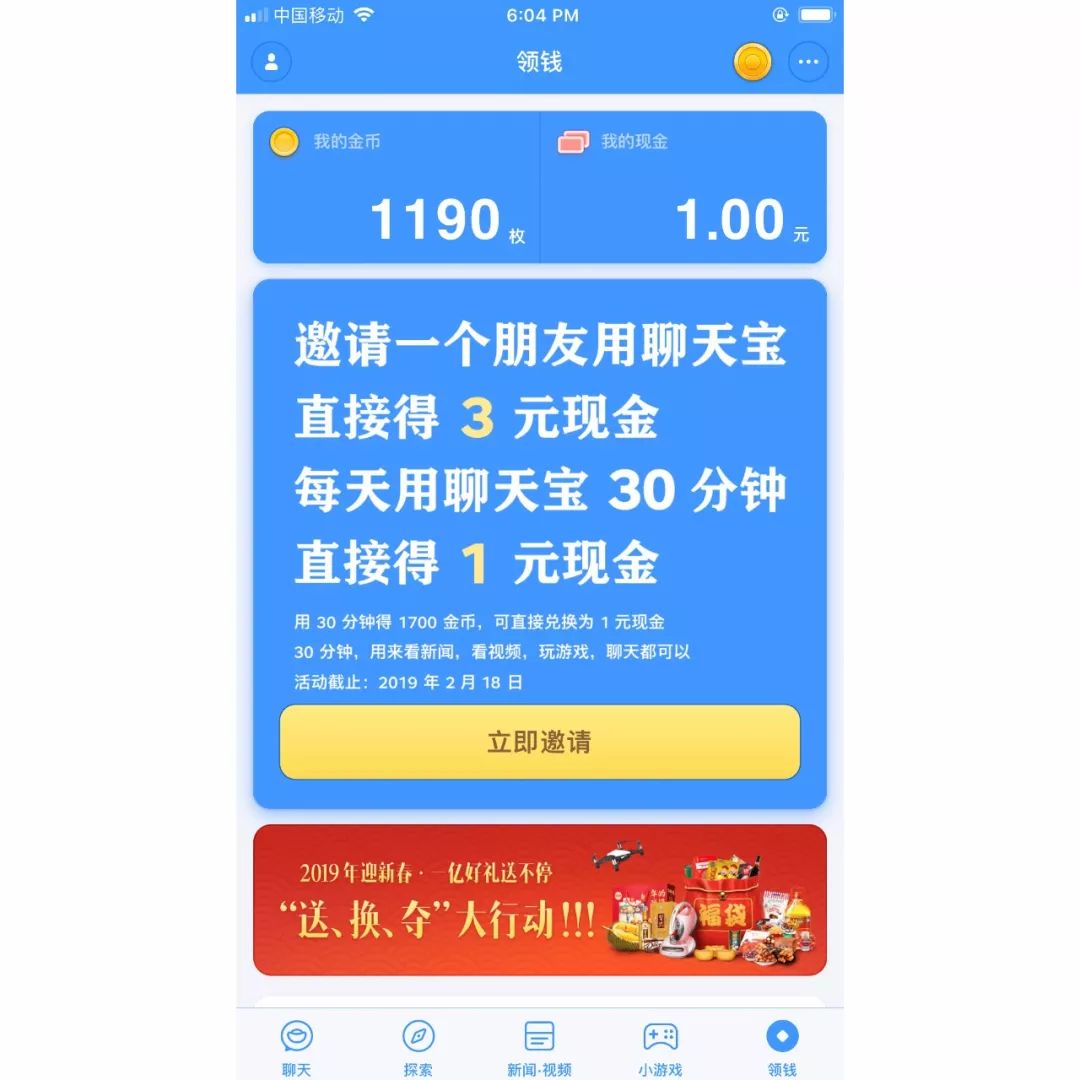 为了吸引更多用户,聊天宝春节期间推出邀请好友得现金玩法,用户可以通过微信、微博、QQ、短信、邀请码等形式邀请好友下载注册App,邀请一个好友用聊天宝可直接得3元现金,累积最高可得2000元。此外,只要用户每天用聊天宝,也可得现金,该活动将于2月18日结束。