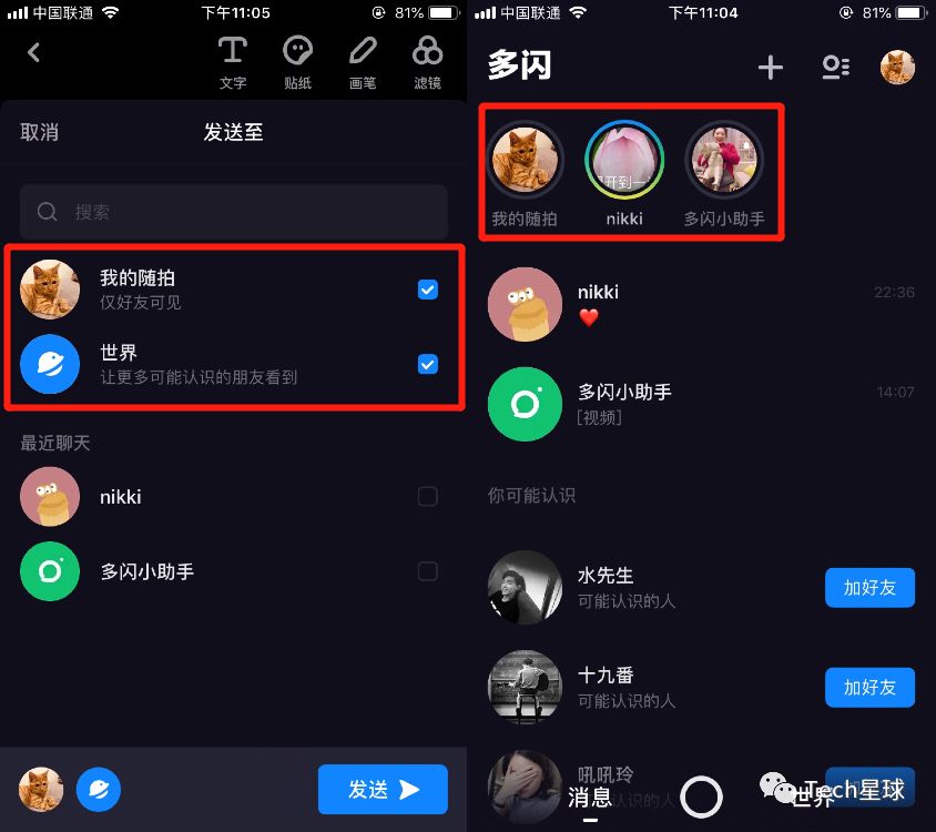 二者对比,微信的视频动态与多闪随拍入口位置相似,一个在单聊消息的顶部;一个在朋友圈的顶部;而且,微信产品调整的时间,也刚刚在发生在多闪上线之后。