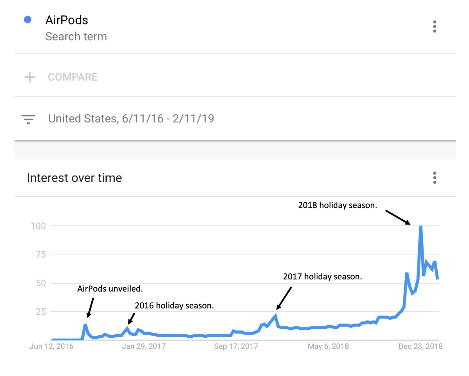 一般来说,在衡量消费者对一个产品的兴趣方面,Google Trends是一个非常有用的工具,尤其是像 AirPods 这样相对较新的产品。