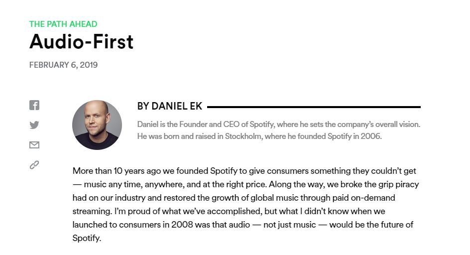 但从长期来看,仰赖“三大”的版权资源无疑仍极大限制了Spotify利润率的增长,净利润的实现更无从谈起。于是,为了谋划更长久的愿景,Spotify CEO Daniel Ek在2月6日的博客中提出新战略:“音频,而不仅仅是音乐,将成为Spotify的未来。”