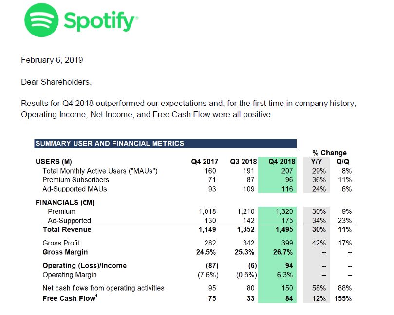 同时,去年Q4也是Spotify首次在季度财报中将营业利润转为正数。可见,虽然在三大唱片公司高昂版权费的钳制下,Spotify 收入越多,其成本增加就越多,但凭借足够庞大的用户基础,Spotify仍有可能实现营业利润。