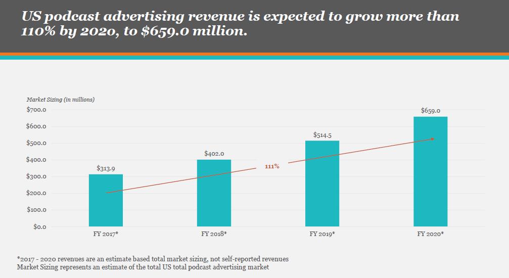 根据美国互动广告局(IAB)和普华永道去年联合发布的研究显示,美国2017年播客市场创造的广告收入为3亿美元左右。而即便是当时预测的、整个市场将在2018年达到的4.02亿,也是远小于去年Spotify一家6.16亿美元的广告收入。