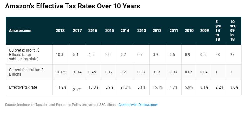 2018年亚马逊净利润112亿美元,但在享受了美国联邦税收抵免(tax credit)和扣除公司高管的股权补偿后,公司获得1.29亿美元的联邦退税,不仅不是税改后21%的企业税率,反而是负1%的税率。2017年亚马逊净利润为56亿美元,获得了1.37亿美元的联邦退税,等于联邦税率为负2.5%。