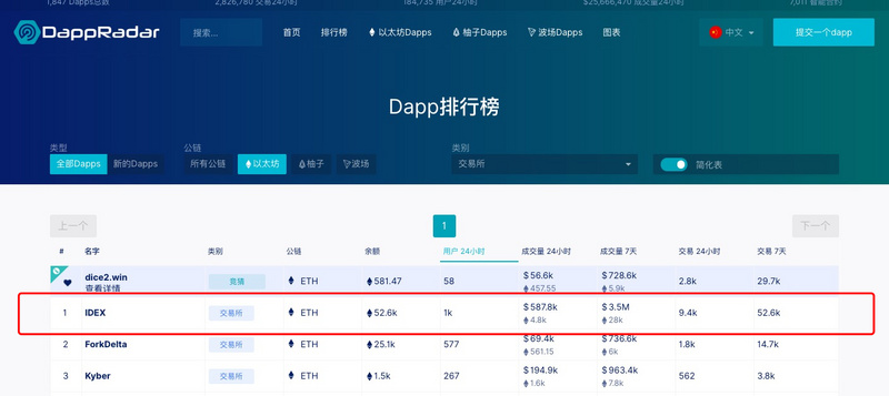 想要体验去中心化交易所 Dapp,如果知道网址,可以直接搜索;如果不知道网址,可以登陆 dappradar 或者 dappreview 查询所要体验的Dapp——IDEX,进入 IDEX 官网。