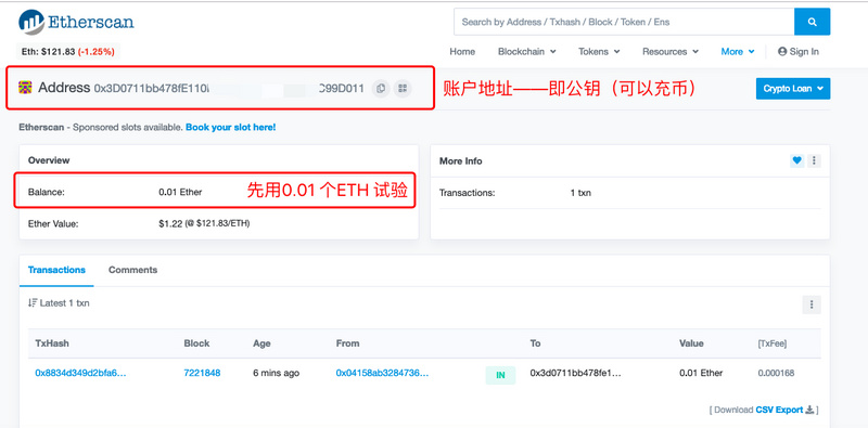 点击该地址,会跳转至 etherscan (以太坊浏览器)页面,说明该地址在以太坊上目前是可查状态,地址有效。但为了验证我们新创建的钱包地址是否能正常充币以及提币,在进行大额转账前,可以先转小额的 ETH 进行试验。