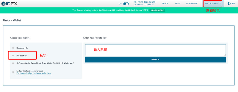 点击首页右上角的“UNLOCK WALLET”,填入你已有以太坊地址的私钥,即可导入地址以及加密货币。