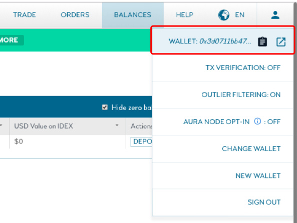 刚刚登陆 IDEX,和传统的中心化交易所一样,我们需要有一个自己的账户,这里的账户就是一个以太坊地址。我们可以选择新建一个地址,也可以选择导入自己已有的以太坊钱包地址。