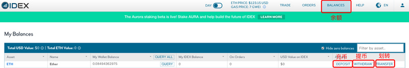 在进行交易前,我们需要将新创建钱包里面的代币划转至 IDEX 交易所地址(其实就是给 IDEX 地址充币)。点击首页的“余额”,再点击“充币”即可实现划转,手续费是正常的 GAS 费,可以自行调整;划转完成后,即可交易。