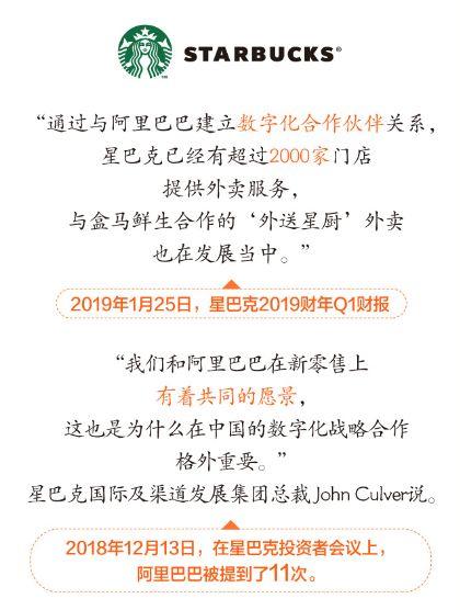 2018年8月开始,阿里和星巴克展开深度合作,不仅跟淘宝、天猫、支付宝打通了会员,还通过饿了么、盒马实现了星巴克的外送,帮助“坐商”星巴克走近消费者——消费者可以手机下单,等着星巴克送上门。而吃到甜头的星巴克也将这一切带回了美国市场:合作Uber Eats,给美国消费者配送咖啡。