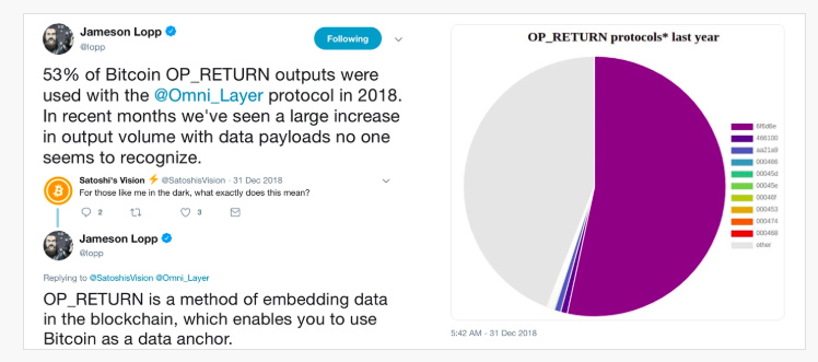 Lopp解释说:“目前 OP_RETURN 输出量的来源已经被确定为Veriblock‘proof of proof’矿工。他们创造了大约20% 的比特币交易。”