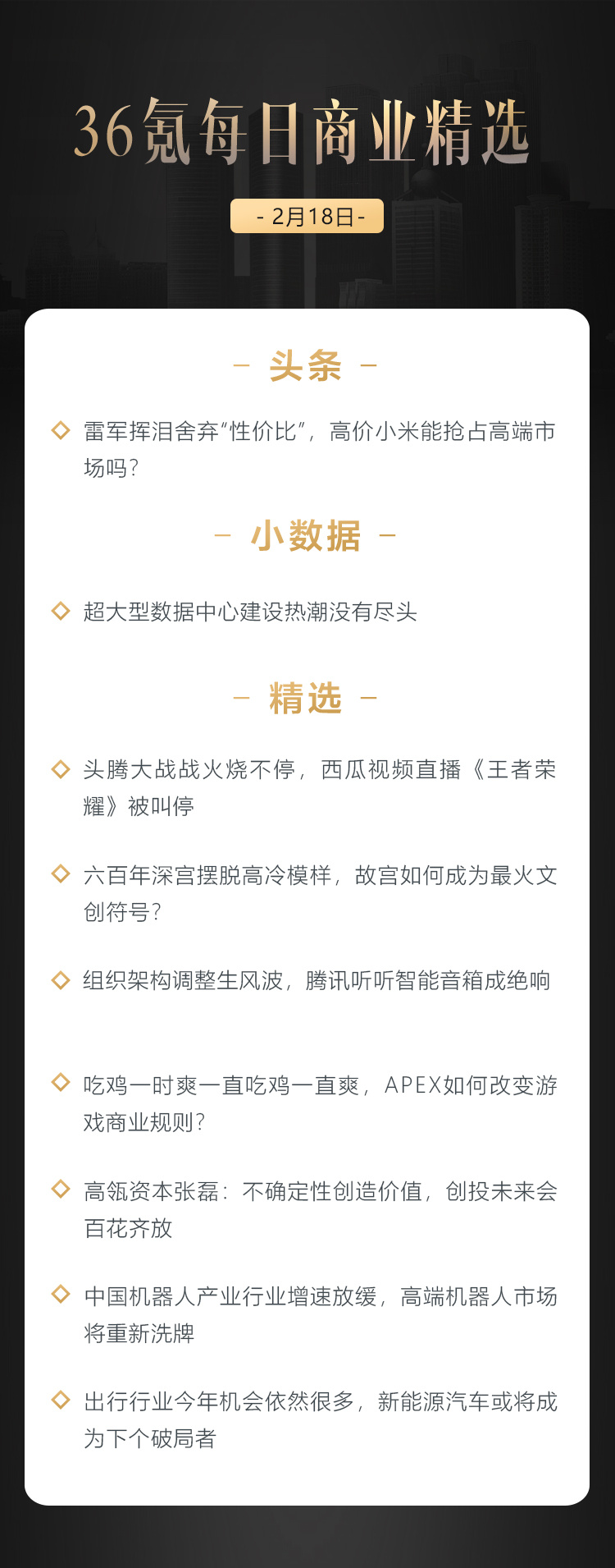本文来自36氪付费栏目《36氪每日商业精选》——2月18日