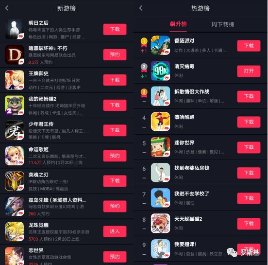 同时,我们也看到抖音在有意向的引导自己平台中的游戏用户。在游戏中心的页面展示方面,抖音游戏中心与常规渠道有细微的差别。有新游榜、热游榜(包含飙升榜、周下载榜)等几部分。
