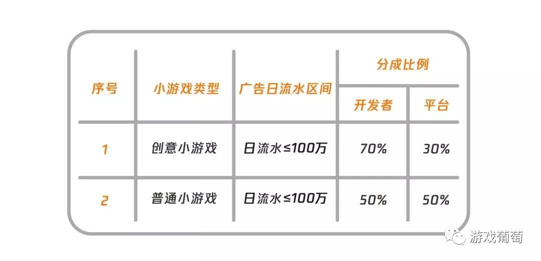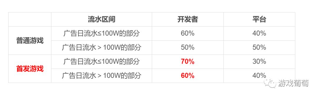 分成方面,普通游戏,广告日流水不超过100万的部分,开发者可以拿到60%,超过100万的部分开发者保留50%;而首发游戏这两个档位的开发者保留比例分别是70%和60%。