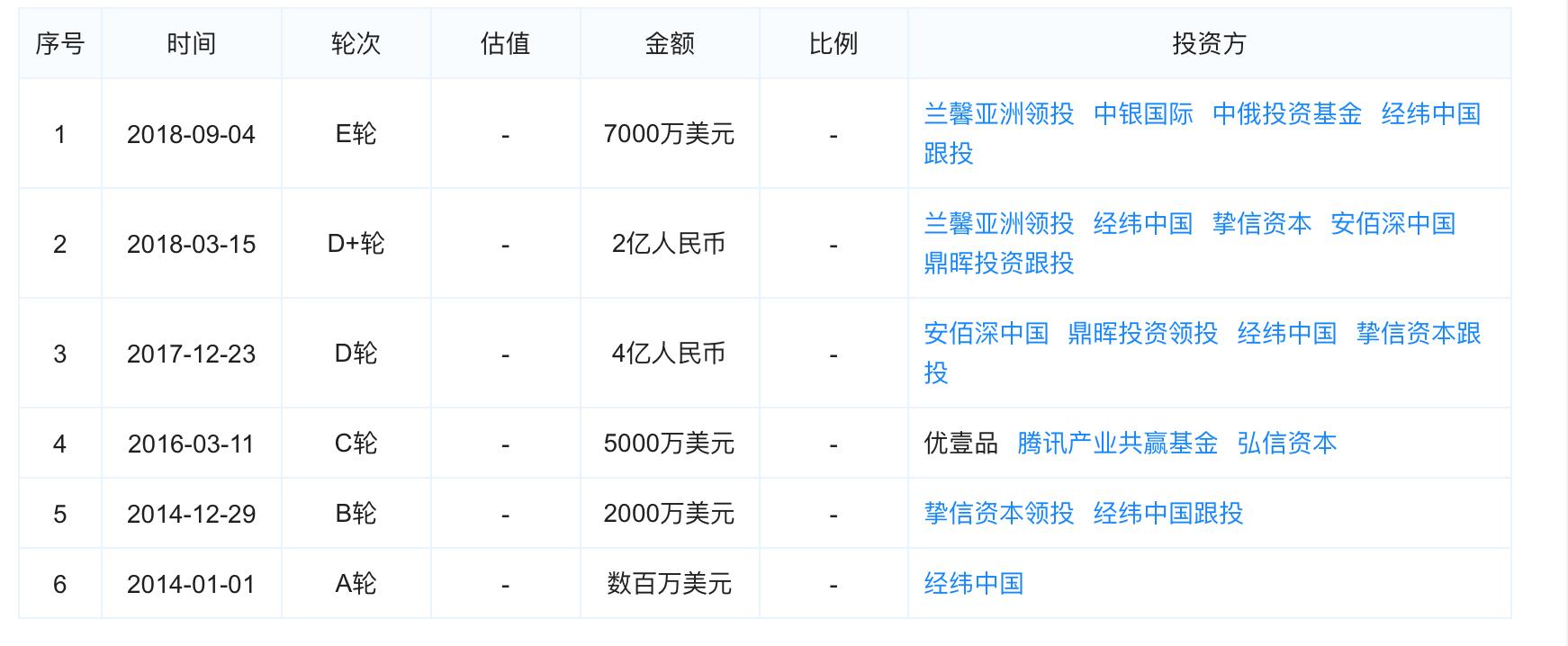 根据天眼查数据显示,该公司此前共进行过6轮融资,在去年9月完成了最新一轮7000万美元的融资,兰馨亚洲投资集团领投,中银国际控、中俄投资基金、经纬中国跟投。