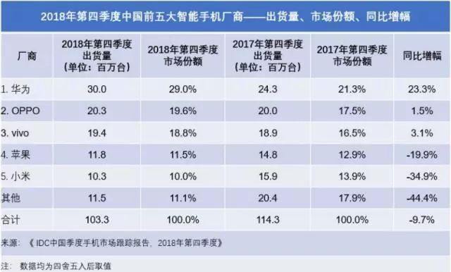 根据IDC的调研报告:2018年第三、第四季度,小米出货量遭遇大幅下滑。2018年三季度,小米手机在中国市场的出货量下滑11%。而IDC的“2018年第四季度中国前五大智能手机出货量数据”更是显示,小米手机出货量同比下跌34.9%。