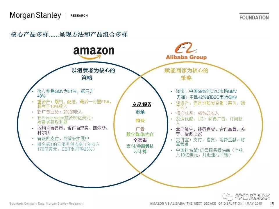 虽然亚马逊/阿里巴巴的核心业务有不同的基础(亚马逊专注于客户至上,阿里巴巴虽然也专注于消费者,但更多的是通过赋能商家完成),我们展示了他们的产品和收入源是如何进行融合......随着电子商务变得更加全渠道,并更加关注于物流