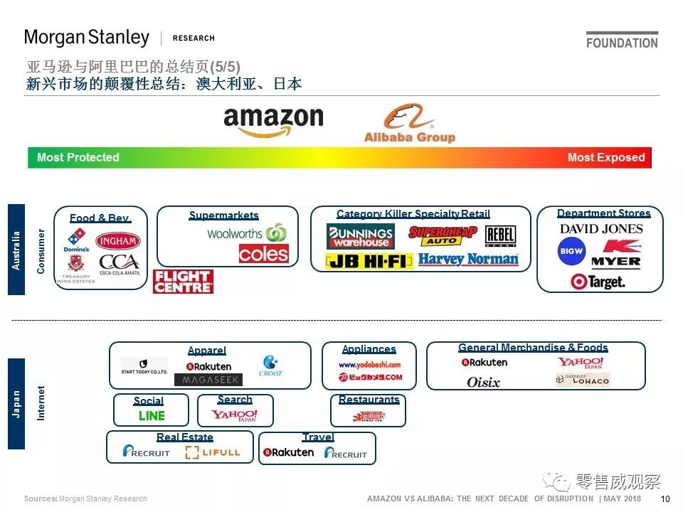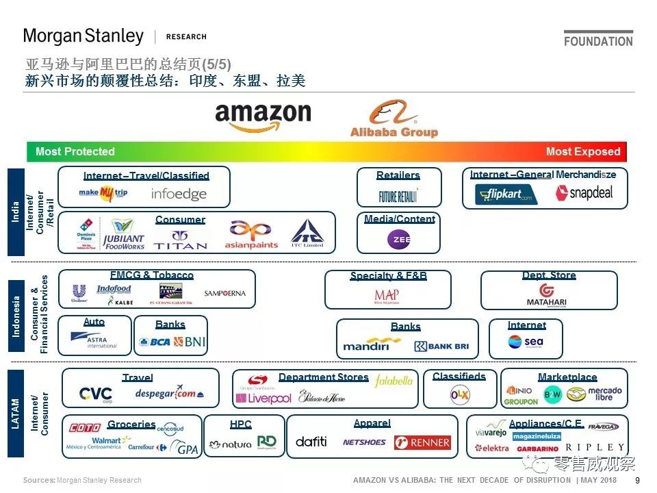 亚马逊/阿里巴巴现在在新兴市场“针锋相对“:我们分析了这两家公司在印度、拉美、东盟和澳大利亚攫取总量5万亿美元的消费者支出方面的努力。目前,我们看到亚马逊在印度领先,阿里巴巴在东盟领先,他们同时都在拉美和澳大利亚“种下火种”。从当地的角度来看,我们认为,在印度的Flipkart和Snapdeal,以及在东盟的Matahari和SEA是首先暴露在两家巨头的火力范围中的;而在印度,最不会受到“攻击”的就是消费者和旅游行业,在东盟就是快消品、烟草和银行。