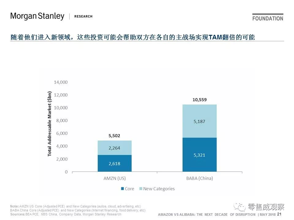 亚马逊/阿里巴巴现在分别在美国/中国推动约66%/33%的消费者增量支出……因为双方都在“本土战场”建立了零售领导地位。也就是说,他们的“投资为先“(包括物流、广告、医疗保健,以及中国新零售等)策略正在扩大其生态系统,并可能使其本国TAM翻倍——亚马逊的美国TAM将从3万亿美元增长到6万亿美元,阿里巴巴的中国TAM增长从5万亿美元到11万亿美元。