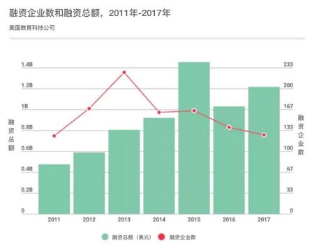 正因为看到这一颠覆传统教育的可能性,全球风投都在积极布局在线教育。美国2017年融资家数126家,融资总额达12亿美元。