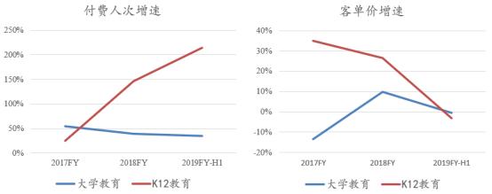 从定量的角度看,教育行业营收来自于付费人次*客单价,K12业务还在爆发期,暂时的客单价增速下滑是由于促销和体验课增多。