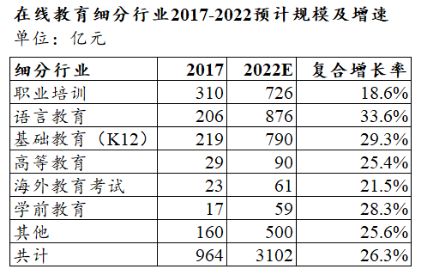 根据弗若斯特沙利文的预测,2017年-2022年,在线教育行业复合增速达26.3%,语言在线教育甚至能达到33.6%(这也是新东方在线的主要战场):