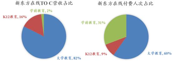 新东方在线2018财年的6.5亿总营收里,To C业务收入5.6亿,占总营收的86%。大学教育又占To C业务收入82%和付费人次的60%,这一块主要包括四六级、研究生考试、留学备考,以及英语技能的提高。