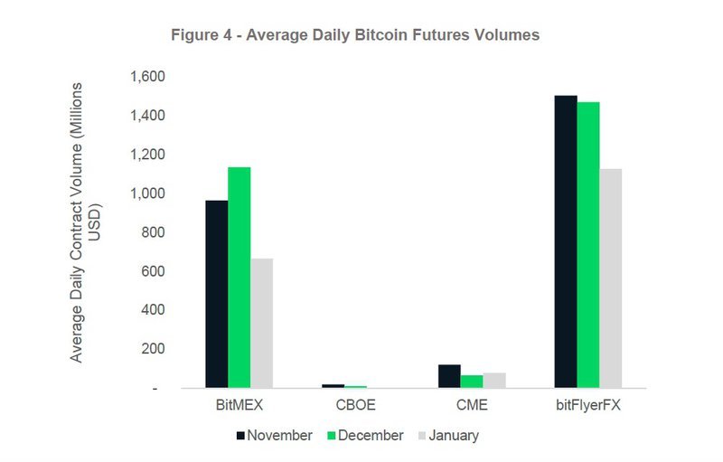 CryptoCompare 报告显示,1 月份 BitFlyerFX 的 BTC 期货交易量最高,每日平均交易量为 11.3 亿美元(自 12 月以来下跌 23%);其次是 BitMEX ,每日平均交易量为 6.65 亿美元(自 12 月以来下跌 41%);CME 和CBOE 的期货产品在比特币期货市场占比 11.7%,高于 12 月份的 6.36%。