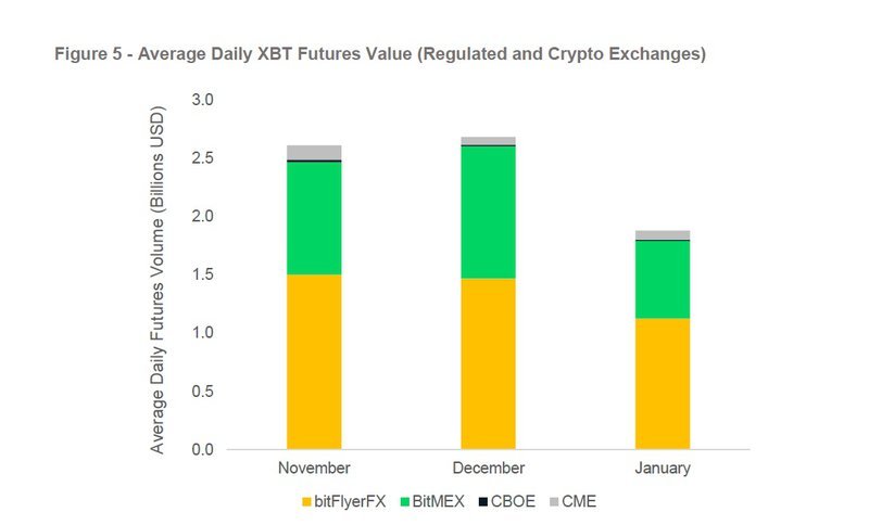 在 CryptoCompare 长达 29 页的报告中,最引人注目的统计数据是,注册于塞舌尔的高杠杆交易所 BitMEX,比特币期货业务在今年1月份出现了惊人的下滑(跌幅41%)。