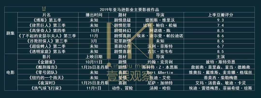 纵观亚马逊影业2019年主要影视项目,我们发现剧集也占很大比重。在今年的项目清单中,就包括经典剧集《律界巨人》《透明家庭》《了不起的麦瑟尔夫人》等剧集的回归。电影方面则有伍迪·艾伦和近年好莱坞当红新生代男演员蒂莫西·柴勒梅德合作的爱情题材影片《纽约的一个雨天》,以及奥斯卡影帝埃迪·雷德梅恩主演的喜剧电影《夜深时》,还有在今年的圣丹斯电影节上广受好评的詹妮弗·莫里森的《酷刑报告》。