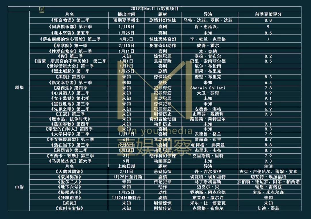进入2019年,Netflix的原创节目也非常值得关注。从2019年Netflix公布的主要影视项目名单中我们不难发现,Netflix在今年还会是以剧集为主,其中《怪奇物语》第三季是Netflix 2019年最受观众期待的剧集。经典剧集《同妻俱乐部》《女子监狱》《马男波杰克》以及由大卫 ·芬奇执导的《心灵猎人》第二季也将再次回归观众视野中。新系列剧集有巴特菲尔德主演的喜剧题材《性爱自修室》,目前该剧豆瓣评分已达9.1。