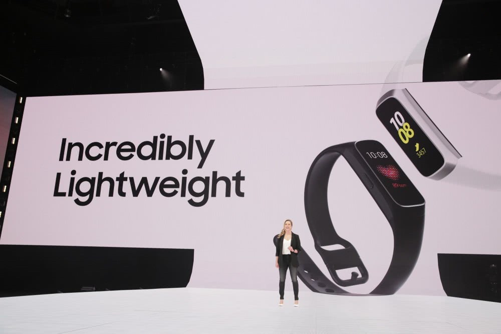 运动手环方面,三星推出了全新的Galaxy Fit,其配置了0.95英寸全彩色触摸感应AMOLED显示屏和橡胶的腕带。支持心率监控,可以无线充电,将于5月31日上市,售价99美元。
