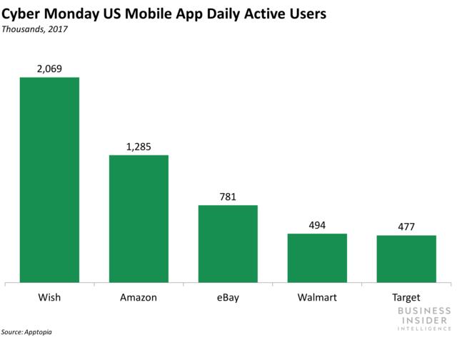 2017年黑五之后的“网络星期一”,它的移动端活跃用户总数更是吊打亚马逊、eBay、沃尔玛等电商零售巨头。