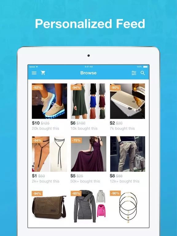 而Wish一开始就瞄准了移动端的市场,投入所有精力和资源到更适合小显示屏的用户设计中。App界面上图片更多,内容短小精悍。