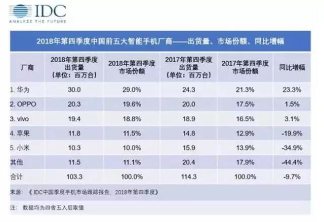 据国际数据公司IDC报告显示,2018年第四季度,中国智能手机市场出货量约1.03亿台,同比降幅9.7%。其中,小米在中国市场的危机比苹果更为严重,出货量同比下滑34.9%,市场份额跌至第五。
