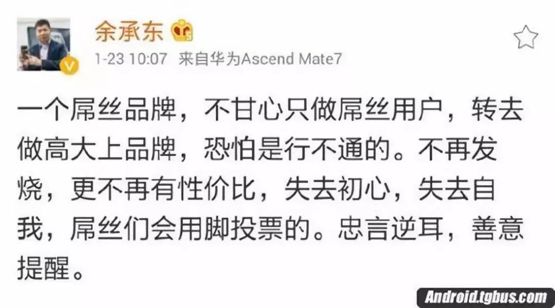 事实上,华为消费者业务CEO余承东早年也说过类似的话,称一个屌丝品牌,不甘心只做屌丝用户,转去做高大上品牌,恐怕是行不通的。不再发烧,更不再有性价比,失去初心,失去自我,屌丝们会用脚投票。忠言逆耳,善意提醒。