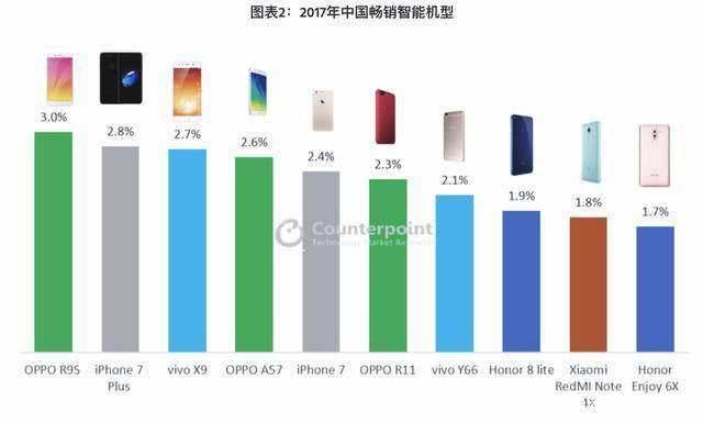 因为在红米走量之外,小米过去多年缺乏提升品牌的爆款,Counterpoint公司整理调查的关于“2017年中国最畅销的十大手机”的榜单中,基本上被OV、iPhone、华为等厂商承包,其中,小米只有一款红米手机进入了第九名。