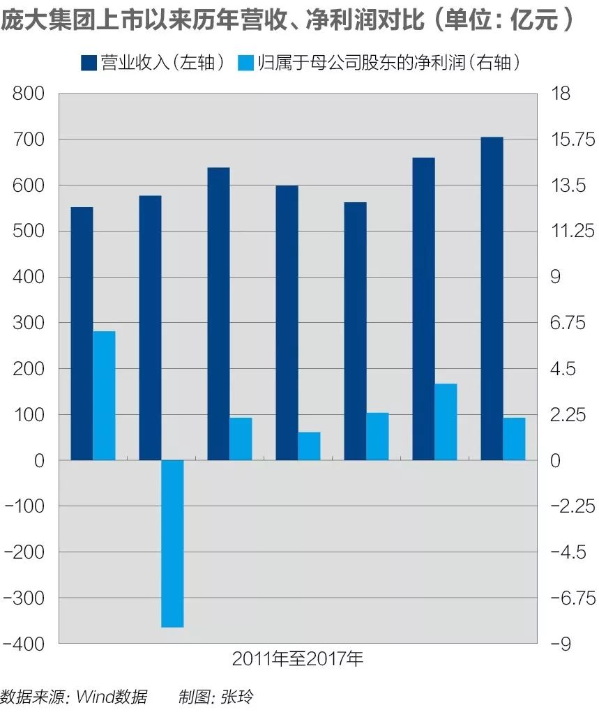 2011年4月28日是他的高光时刻,庞大集团正式登陆A股。彼时,拥有乘用车、商用车、卡车、微型面包车、汽车养护服务等五大业务板块的庞大集团光环萦绕,业内对其不吝赞美之词,称其为国内起步最早、规模最大、毛利率最高、抗风险能力最强的企业。