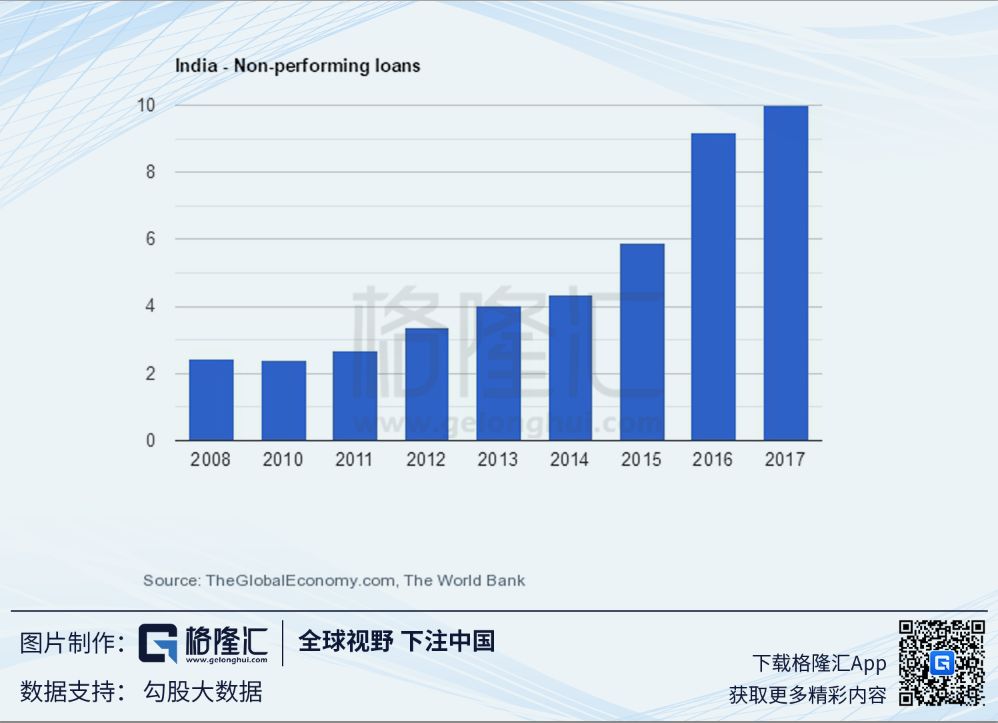 政府的治理能力差,导致印度的经济大起大落之余,银行系统已经深受其害,2017年不良贷款率已经攀升至9.98%的水平(达到技术性破产的底部),影响到了金融体系的稳定性。